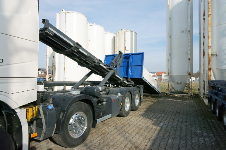 Stationiert in Ampfing bei München ist der Lkw auch in der Schweiz und Österreich unterwegs. Vielfach sind die Baustellen nicht so leicht anfahrbar. Der 4-Achser ist durch seine bessere Wendigkeit gegenüber einem Siloauflieger-Lkw klar im Vorteil. Der Einsatz als Gliederzug ist möglich. Der Combilift fährt natürlich auch DIN Wechselcontainer, wie jeder andere Hakenabroll-Lkw und nimmt Wechselpritschen, die mit Hakenöse ausgestattet sind, auf. Hier überzeugt abermals sein sehr flacher Aufnahmewinkel. Kleine Baumaschinen, Aggregate oder auf der Baustelle benötigtes Stückgut kann der Combilift problemlos auf einem Flat oder einer Pritsche transportieren und Vorort ablegen. Der Volvo hat selbstverständlich EURO 6. Auch die Generation 2015 des Combilift ist ohne Einschränkungen für Lkw nach EURO 6 geeignet. Das komplette Gerät wird oberhalb des Lkw-Chassis aufgebaut. Der Kippwinkel konnte dadurch von 94° auf 98° erhöht werden. Trotz der beiden neuen Hilfszylinder sind die Abrollkipper der Typen CL 26.72 und CL 35.72 nicht schwerer als ihre Vorgänger. Schwerpunkt seines Einsatzspektrums sind der Transport und die Abstellung aller am Markt gängigen Wechselsilos. Die Möglichkeit der